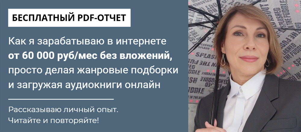Решила поделиться опытом и написала PDF-отчет, в котором рассказываю, как можно начать зарабатывать в интернете, просто создавая жанровые подборки и загружая аудиокниги онлайн: