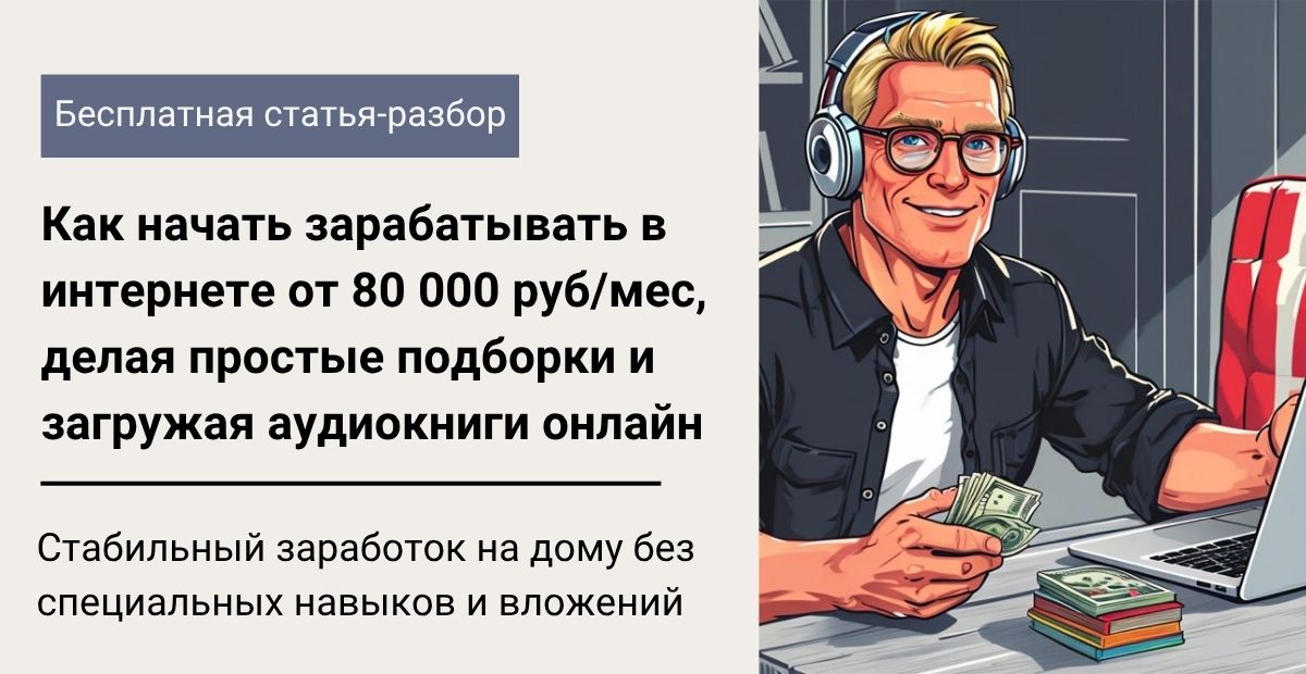 Получите бесплатную статью-разбор и узнайте, как начать зарабатывать в интернете, просто создавая жанровые подборки и загружая аудиокниги онлайн: