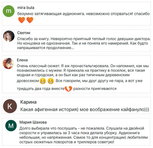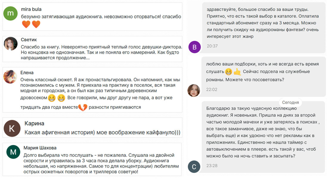 Ниже примеры отзывов, которые люди оставляют на подборки любовных аудиокниг одной из наших участниц Юлии. Такие сообщения приходят ей регулярно.
