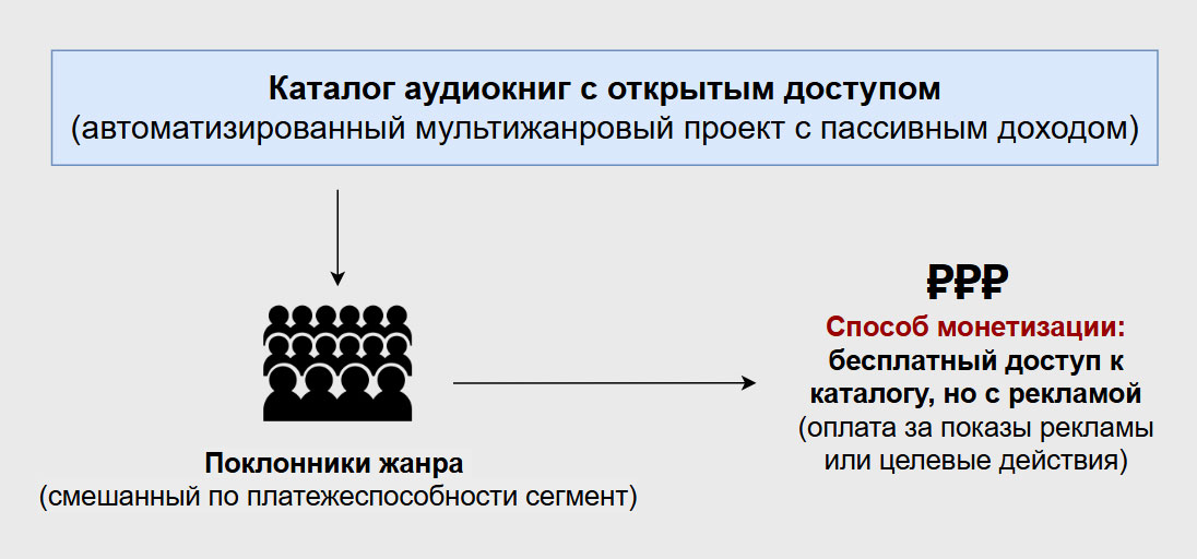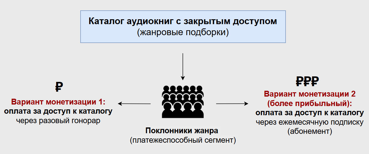 Монетизация направлена в первую очередь на платежеспособный сегмент наиболее заинтересованных любителей аудиокниг конкретного жанра (фанатов) и происходит через продажу доступа к каталогу за единоразовое вознаграждение (гонорар) или постоянный абонемент (ежемесячную подписку).