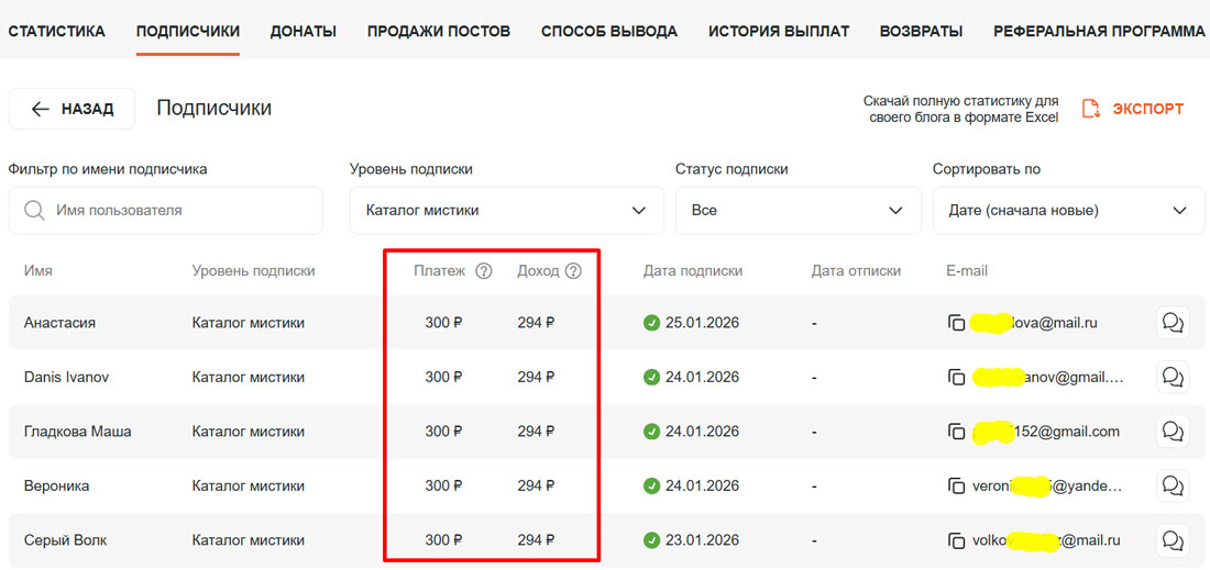 Ниже пример платных подписок Ангелины на каталог мистических аудиокниг.