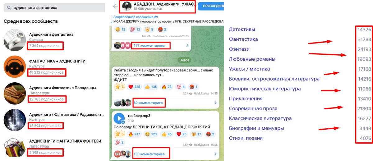 ➡️ Имеют собственные огромные аудитории, по размеру превосходящие целые отдельные ниши (все благодаря гигантскому объему самой ниши аудиокниг, о чем я упоминал в прошлой части: даже, если ее дробить на сегменты, аудитория в них при любом раскладе остается очень большой).